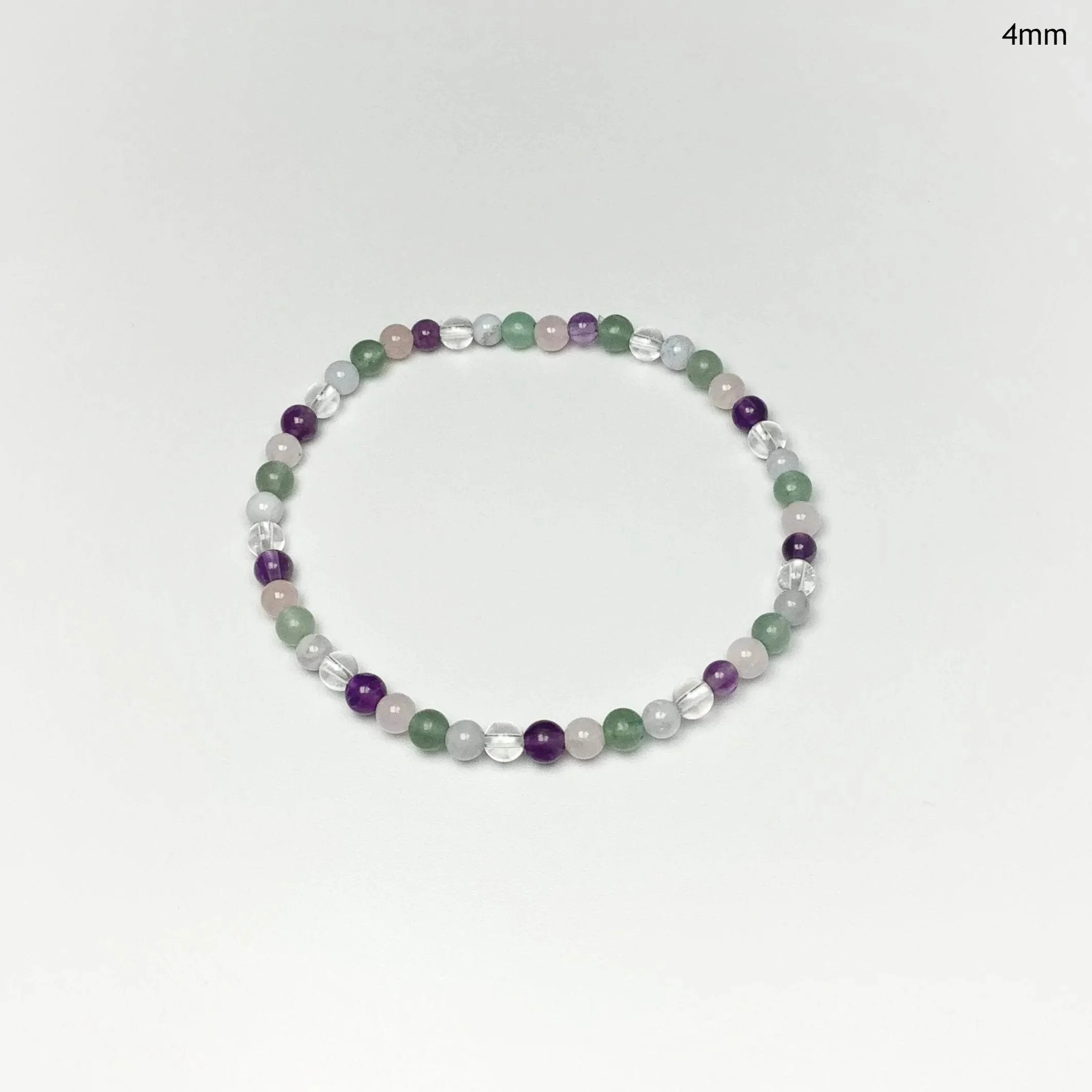 This special bracelet features an assortment of crystalline stones, including amethyst, blue lace agate, green aventurine, quartz and rose quartz.
