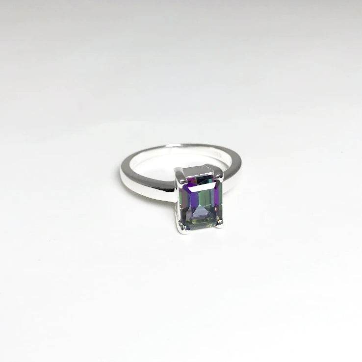 Mystic Topaz is an enhanced clear topaz. In order to create it, clear topaz is first cut then treated in the USA on the back of the stone with a permanent bond to give it unique kaleidoscopic colours, prominently greens, blues and purples. Since this process only affects the surface of the stone, special care should be taken of your piece.